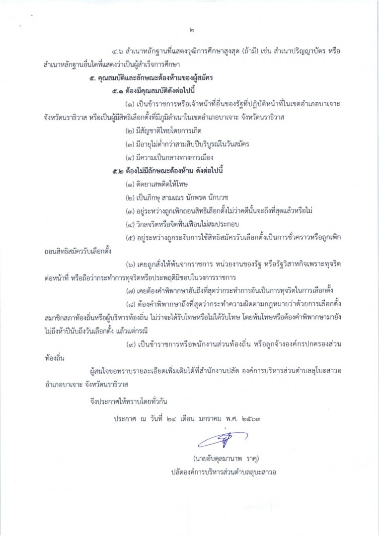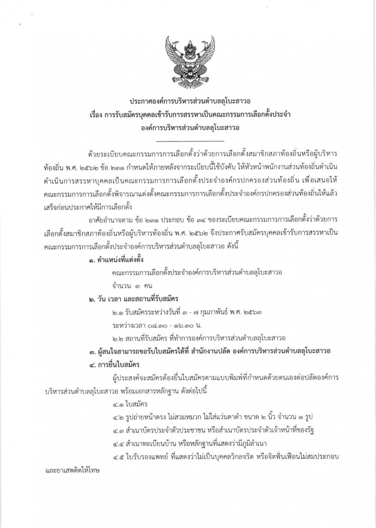 ประกาศองค์การบริหารส่วนตำบลลุโบะสาวอ เรื่อง รับสมัครบุคคลเข้ารับการสรรหาเป็นคณะกรรมการเลือกตั้งประจำองค์การบริหารส่วนตำบลลุโบะสาวอ