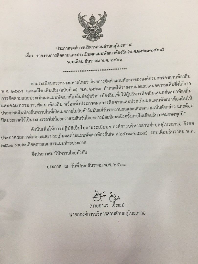 ประกาศ รายงานการติดตามและประเมินผลแผนพัฒนาท้องถิ่น 2561-2564